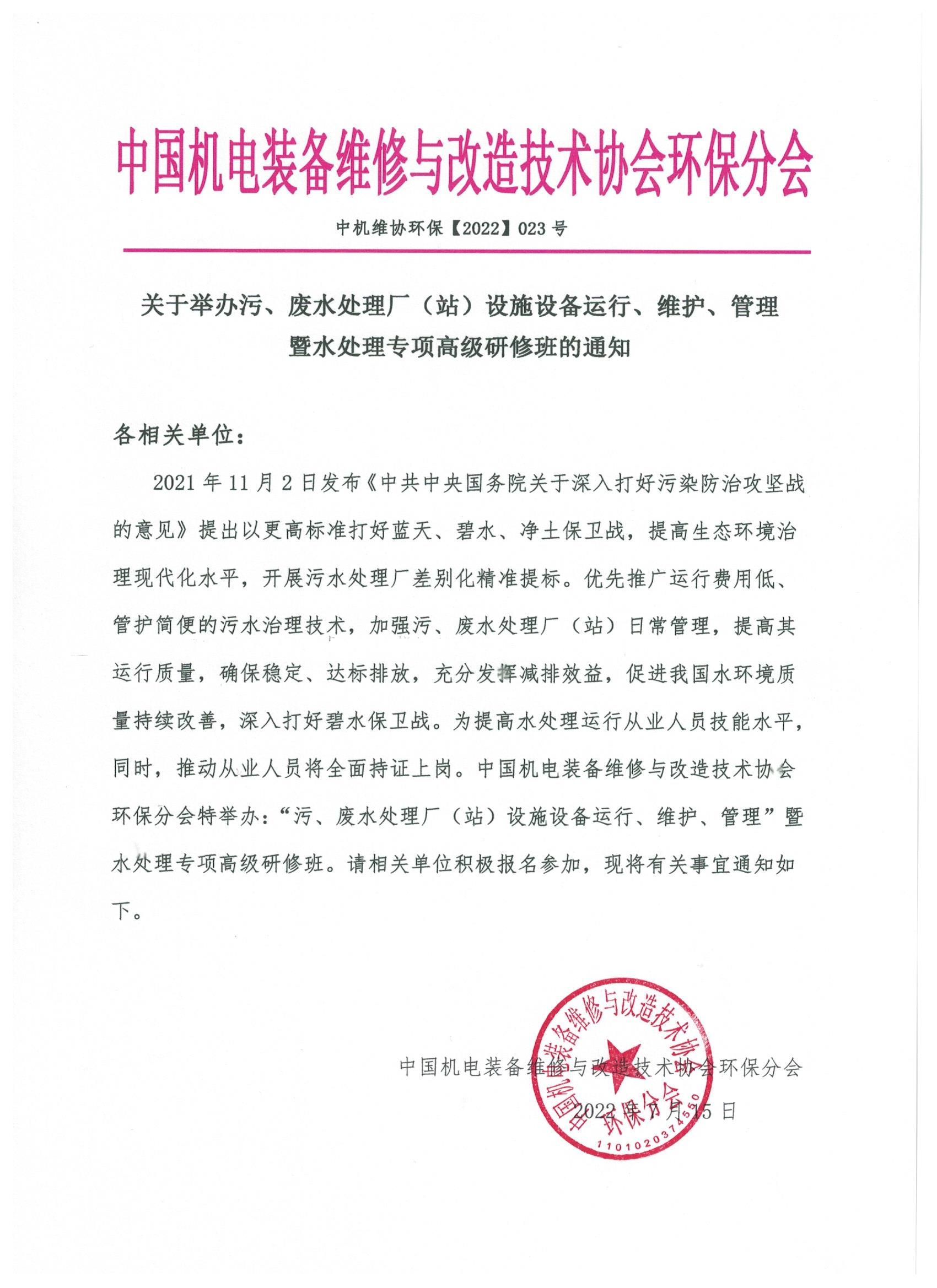 關(guān)于舉辦污、廢水處理廠(站)設(shè)施設(shè)備運(yùn)行、維護(hù)、管理”暨水處理專(zhuān)項(xiàng)高級(jí)研修班的通知!