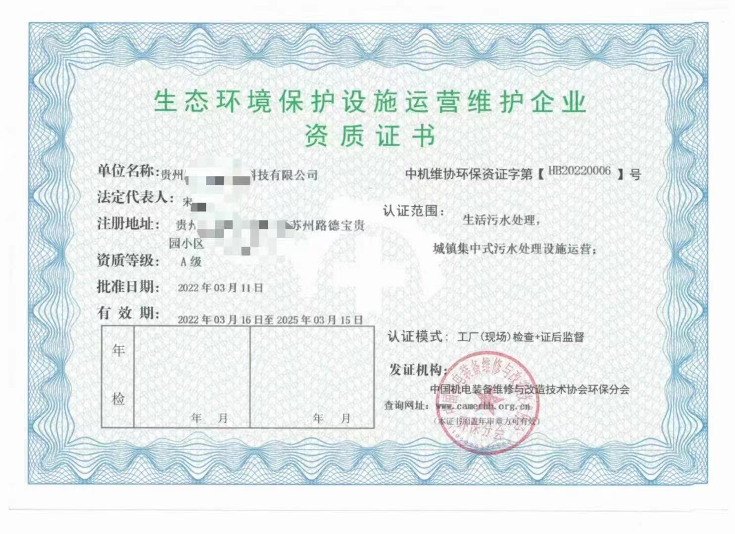 經(jīng)過(guò)初審、現(xiàn)場(chǎng)審核、復(fù)審?fù)ㄟ^(guò)的企業(yè),由中國(guó)機(jī)電裝備維修與改造技術(shù)協(xié)會(huì)環(huán)保分會(huì)統(tǒng)一頒發(fā)《生態(tài)環(huán)境保護(hù)設(shè)施運(yùn)營(yíng)維護(hù)企業(yè)》資質(zhì)證書。