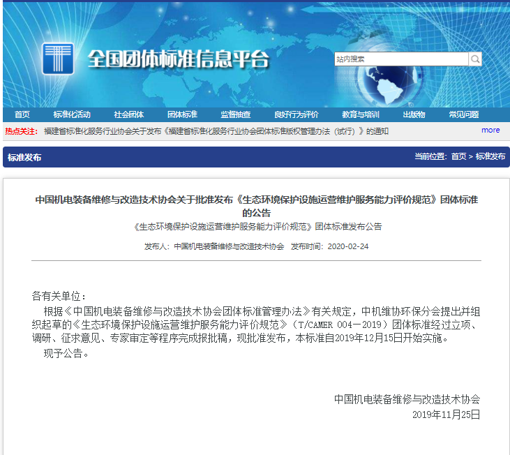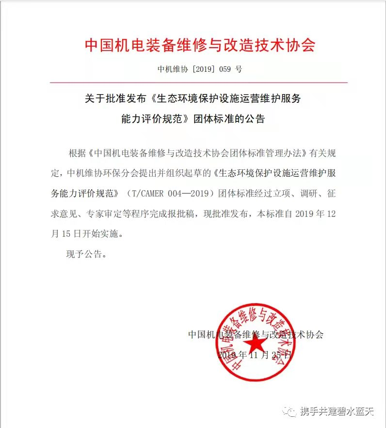 由鳳凰網(wǎng)報道,由中國機電裝備維修改造技術協(xié)會發(fā)起,聯(lián)合河北省環(huán)保治理運營行業(yè)協(xié)會、佛山市中環(huán)環(huán)保技術研究中心、中機國際工程設計研究院有限責任有限公司華東分院、廣東敏義環(huán)境科技有限公司、深圳市環(huán)境治理光電產(chǎn)業(yè)有限公司、佛山攸威光電科技有限公司、山東領先機械制造有限公司、山東濟寧精誠科技有限公司、山東棗莊遠程環(huán)??萍加邢薰?、石家莊科林威爾環(huán)??萍加邢薰疽约笆仪f曼特水處理有限公司共同起草的《生態(tài)環(huán)境保護設施運營維護服務能力評價規(guī)范》團體標準,于2019年11月25日獲批發(fā)布,并于2019年12月15日正式實施。這是由協(xié)會牽頭制定的又一項關于生態(tài)環(huán)境行業(yè)方面的團體標準,不僅為提高生態(tài)環(huán)境保護設施運營維護企業(yè)的運營服務質量控制奠定良好的基礎,更為第三方治理行業(yè)的良性健康發(fā)展保駕護航。
